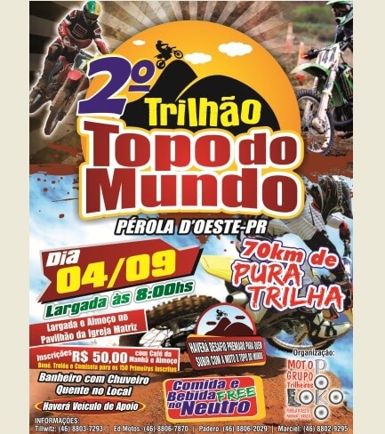 Em nome do grupo TRILAS CAPANEMA quero parabenizar todos do gurpo de perola POKO LOKO pelo passeio pelo organização e união do gropo que no passado já fisemos parte ai e o padeiro que ñ desiste nunca um grande abraço a todos. E convido todos ao 1° ENDURO DOCE IGUAÇU COM PASSEIO TRILHA NO DIA 13-11-2011.